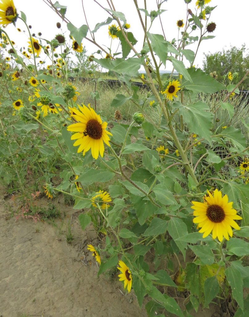 Some individual plants are indeed tall, surpassing six feet in height. Those are mostly the Common Sunflower, Helianthus annuus. Locally, we also have Prairie Sunflower, Helianthus petiolaris, which is usually shorter, with purplish stems instead of yellowish green, and smaller, darker leaves.